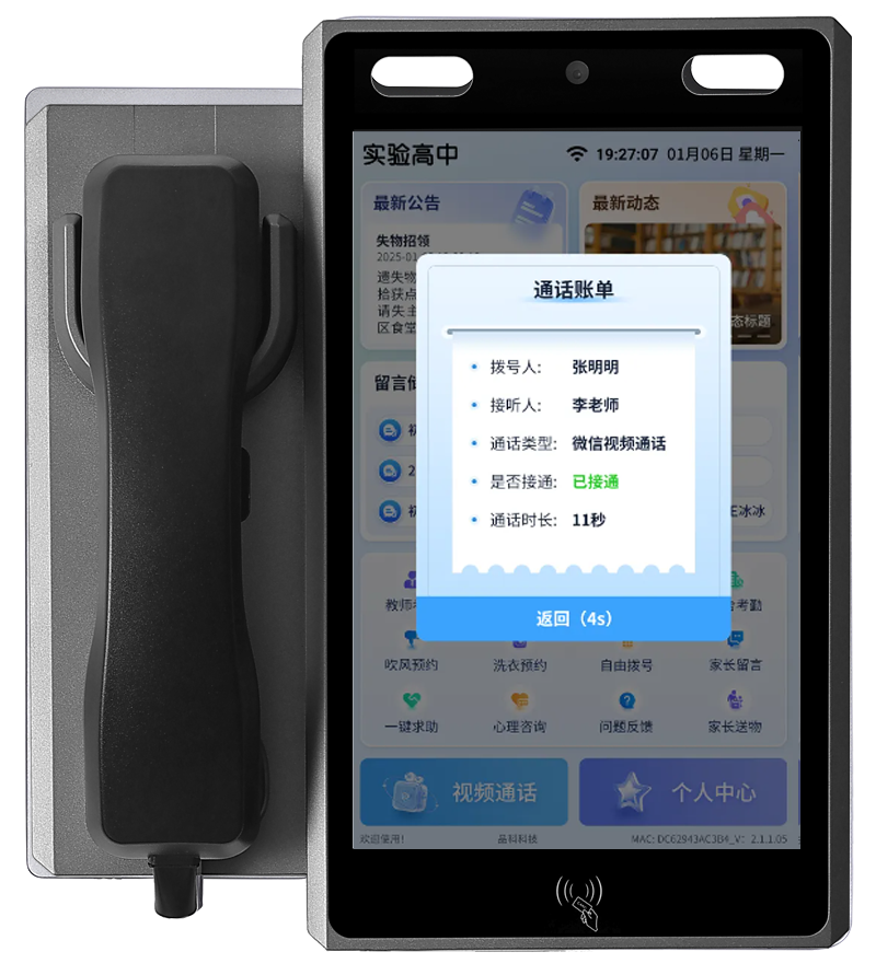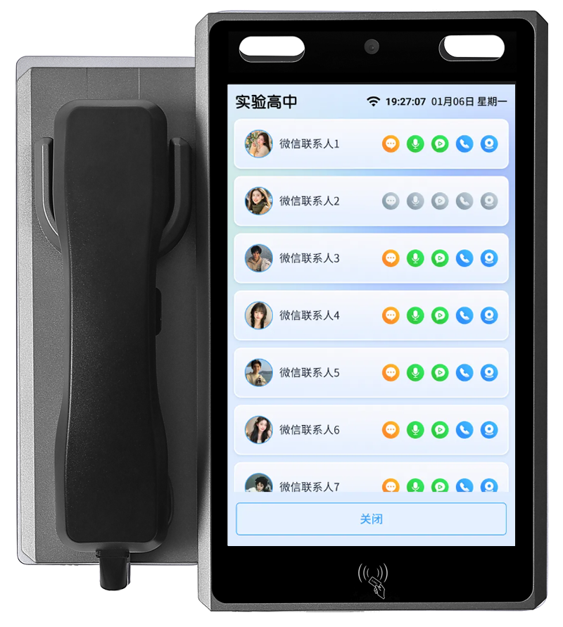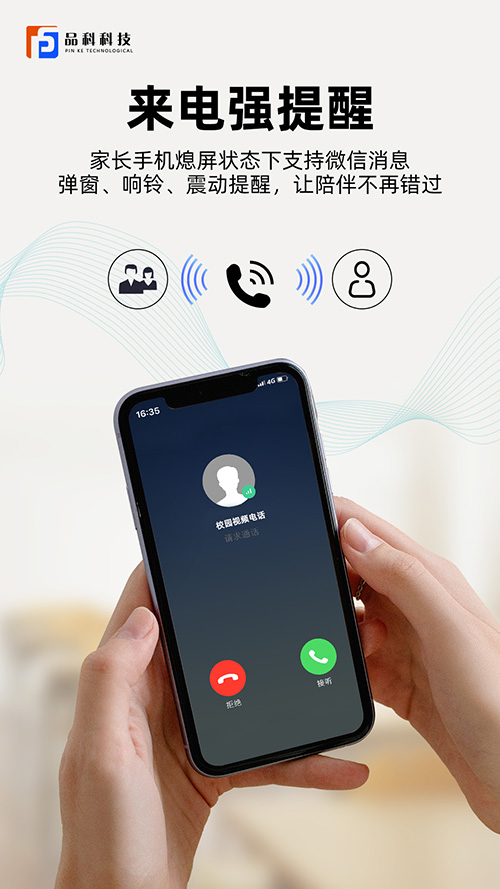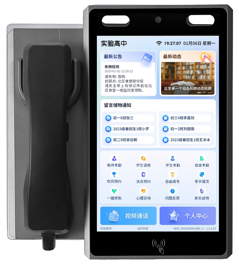 家校親情通話系統通過可視電話作為硬件載體,利用微信小程序平臺,家長無需安裝APP等操作,為學生和家長搭建音視頻通訊的橋梁,放置在教室或宿舍等多個區域,可融合人臉識別技術學生刷臉登陸,呼叫家長的電話,實現校園親情微信視頻通話連接,建立智慧信息化數字校園。